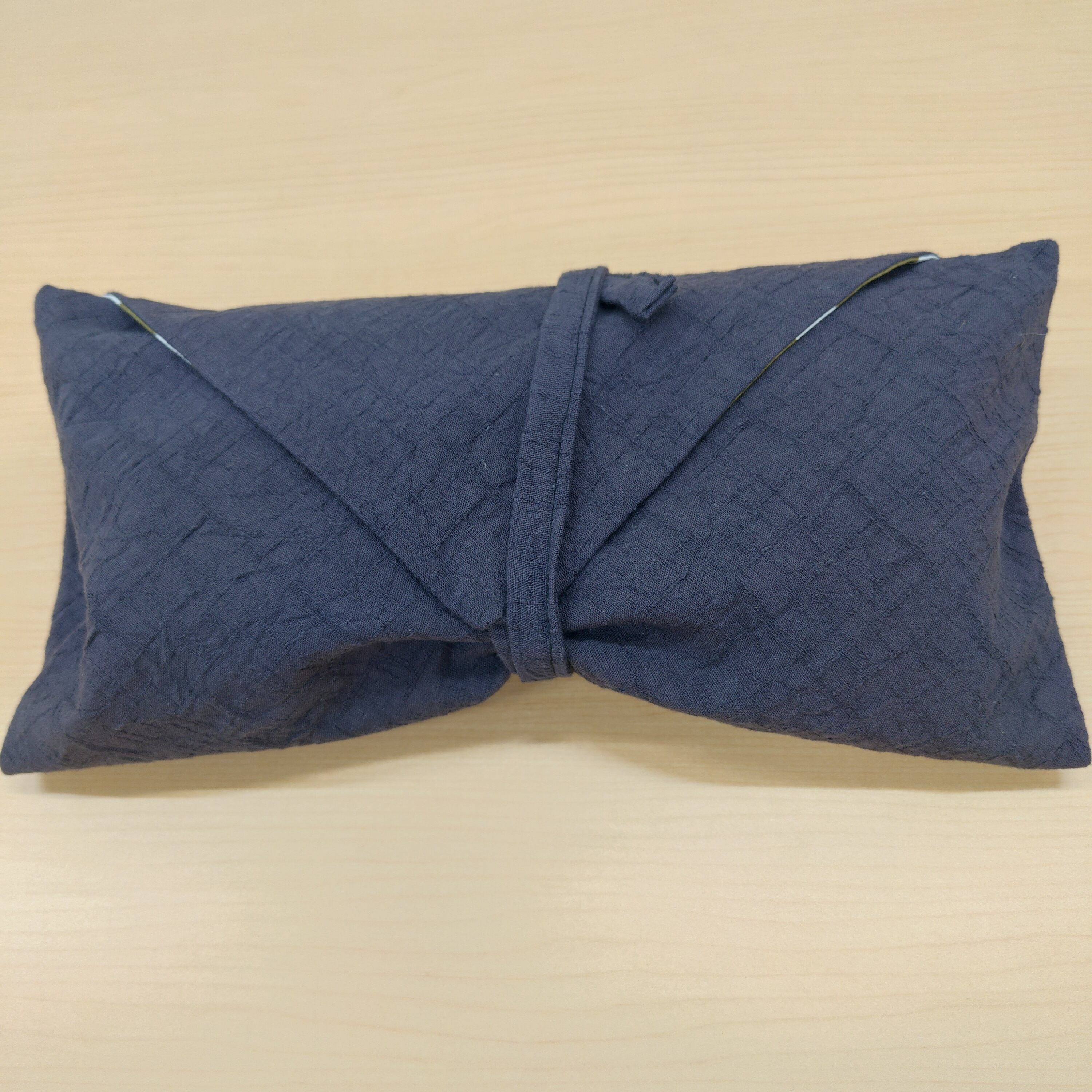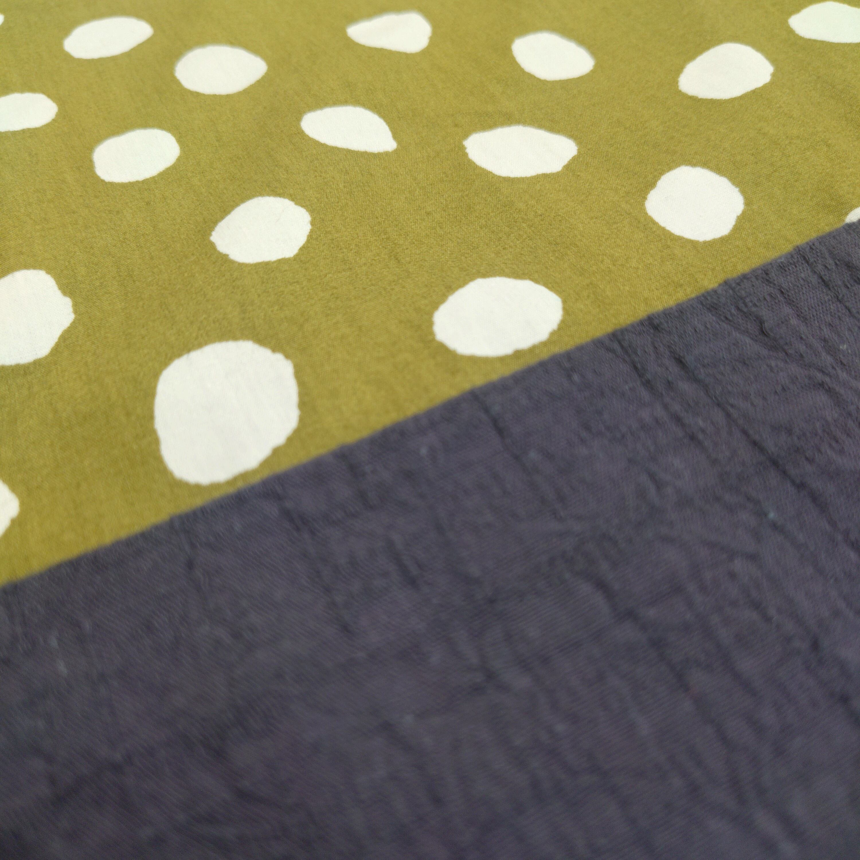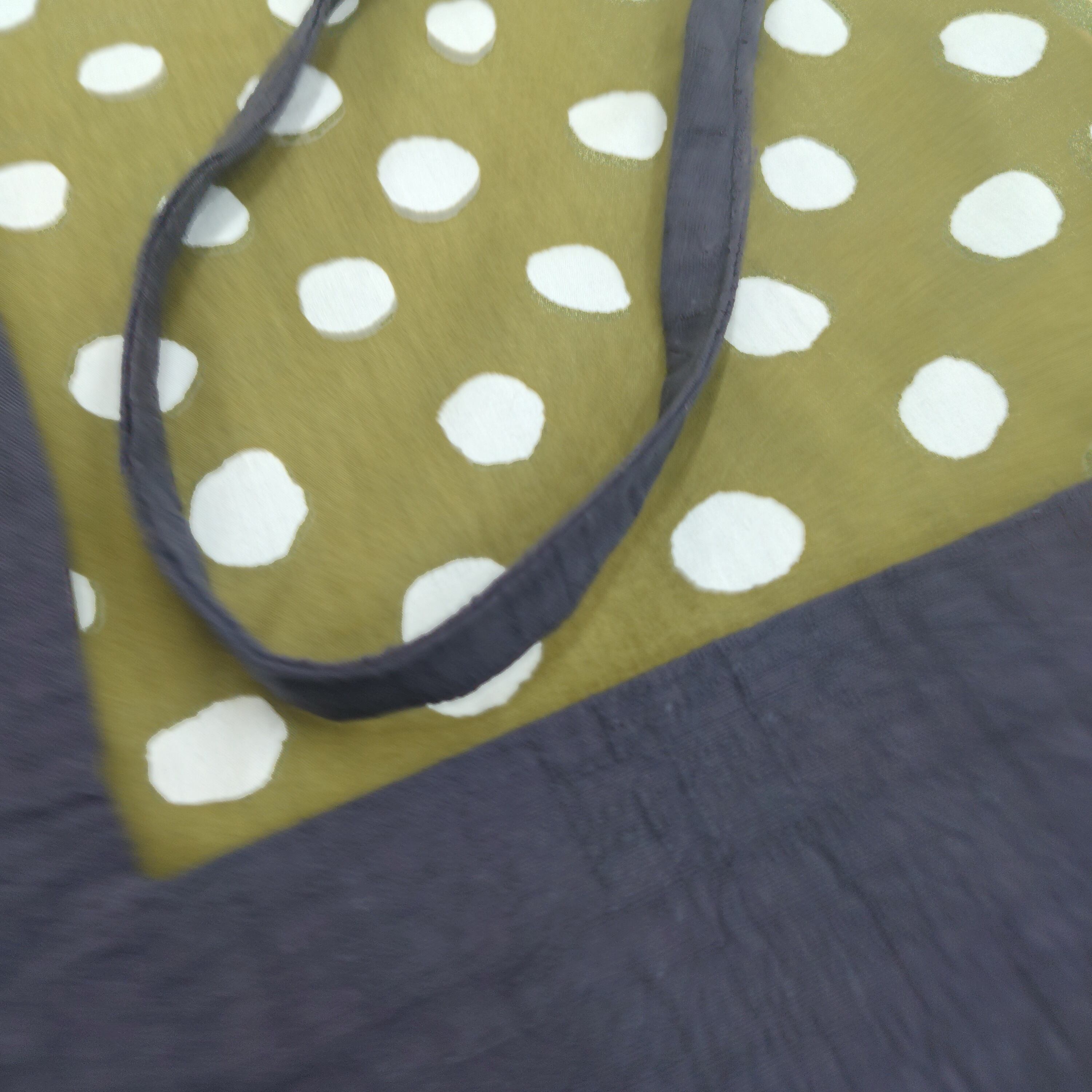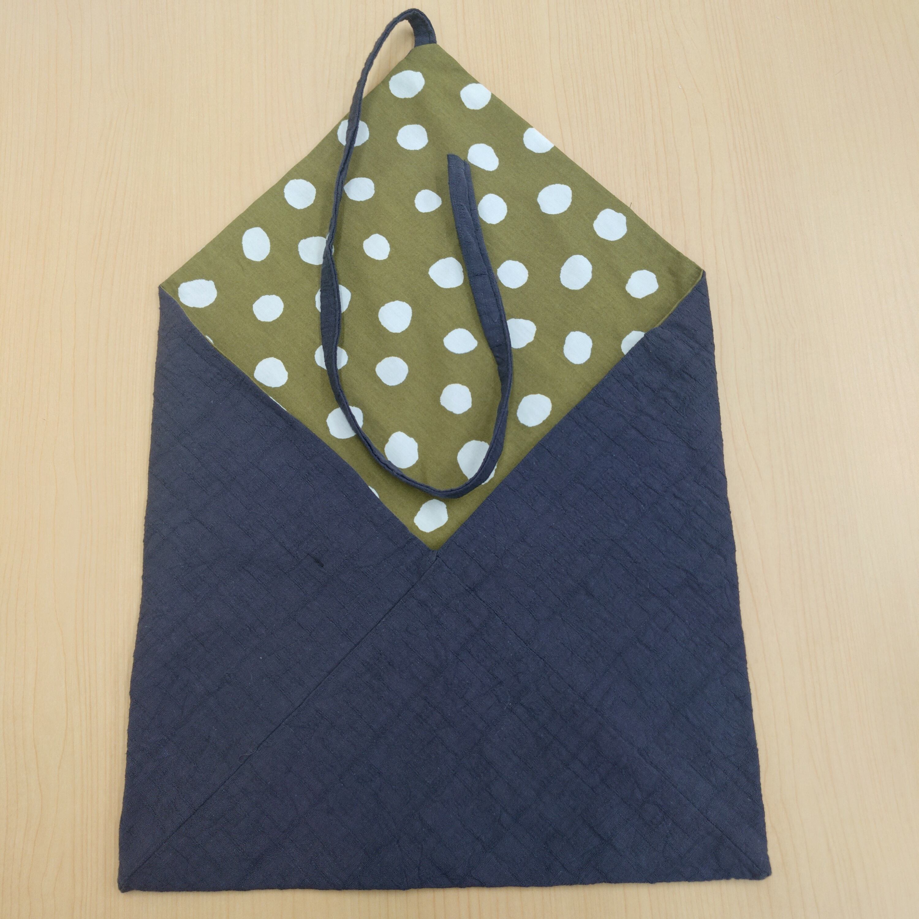 凹凸のある紺色の生地に中は緑地に白の水玉。