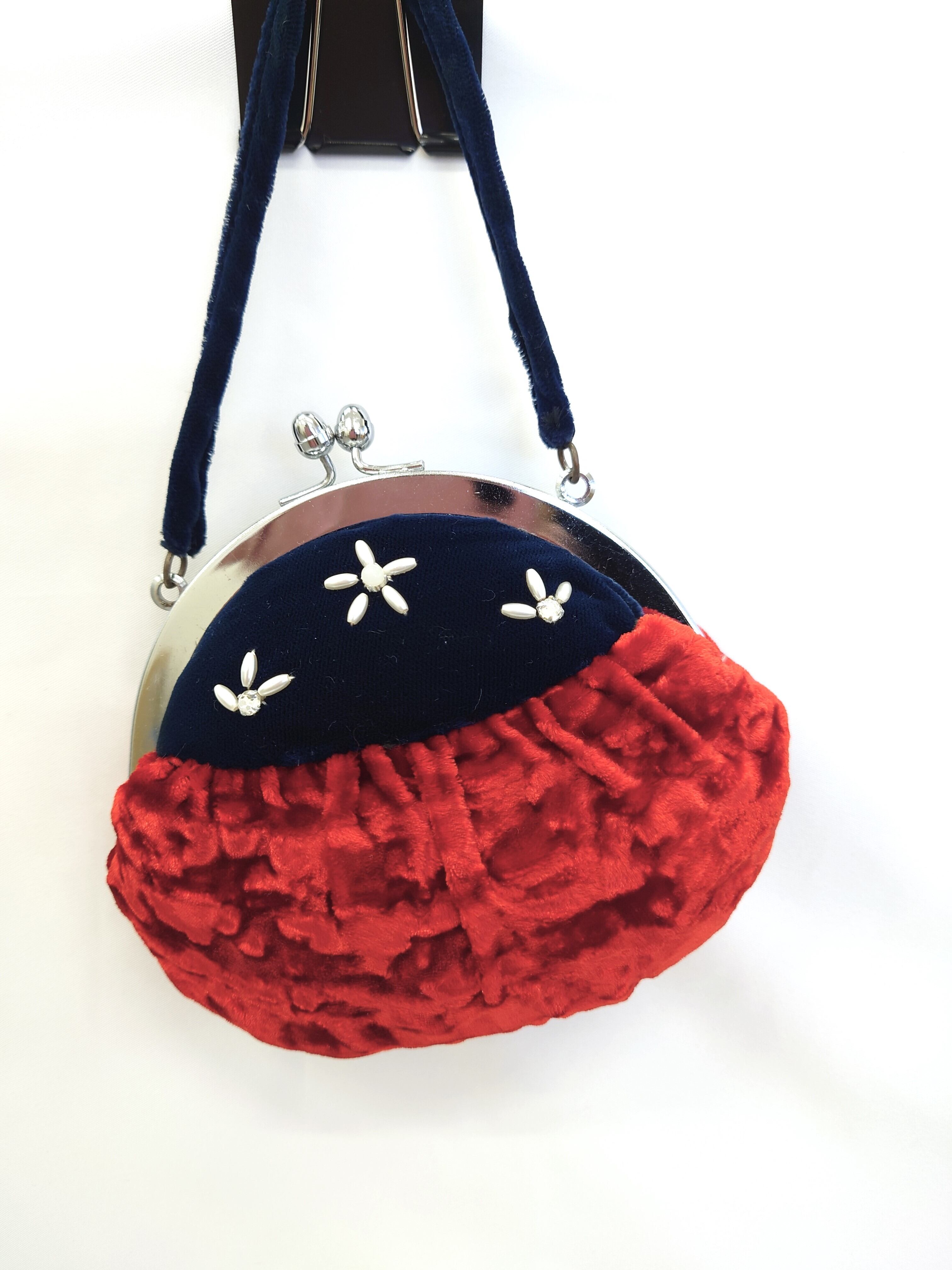 【バッグ】ビーズパールビロードがま口バッグ/紺&赤